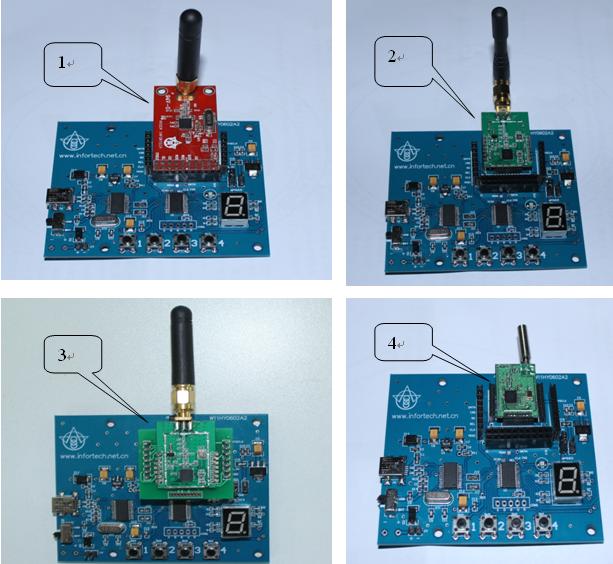 1:AX5051模塊,用于433MHz的數(shù)據(jù)通信。共有4種插座適應(yīng)4種AX5051模塊。