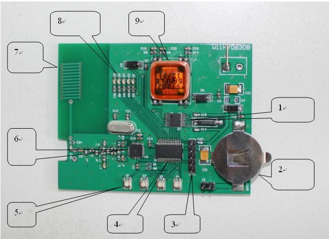 卡片段由PIC16F1933,AX5051,AS3932,3D天線,按鍵,LED,電池卡座等組成。