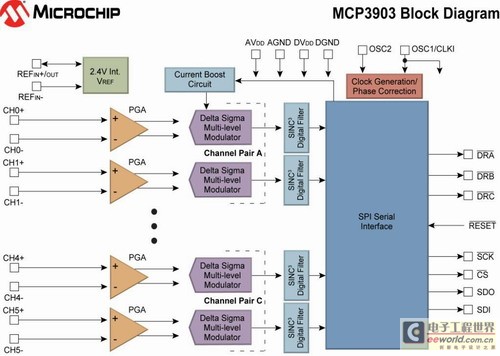新器件包括六個(gè)16/24位ADC、集成PGA、低漂移電壓參考、相位延遲補(bǔ)償和調(diào)制器輸出模塊